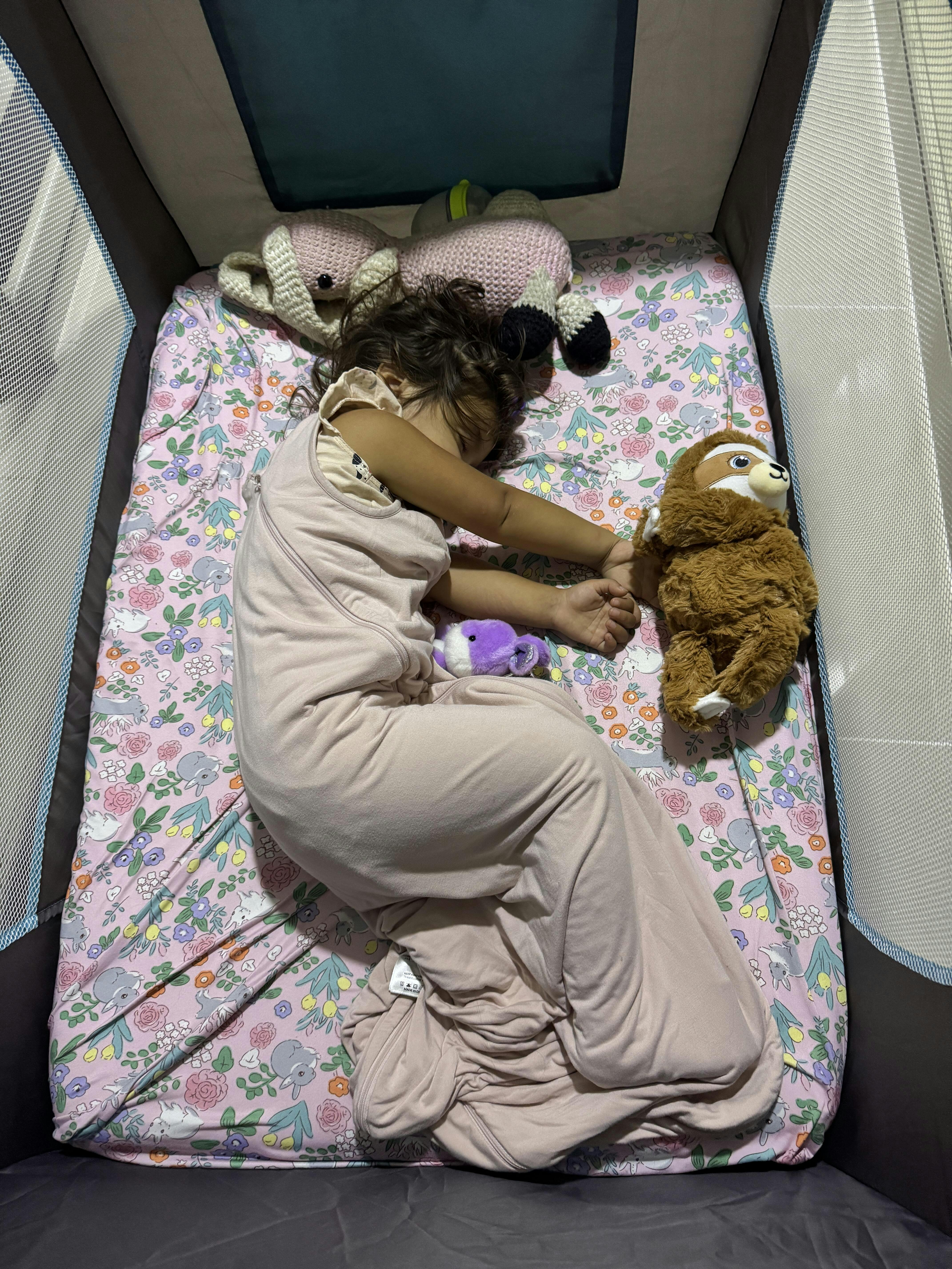 Our daughter loves this Sloth! It’s so cute, cuddly, and calming. The best thing is we can wash it in the washing machine and you can turn down the volume so her ears are safe.